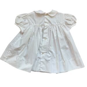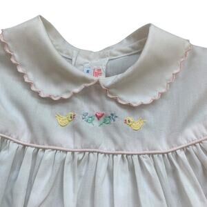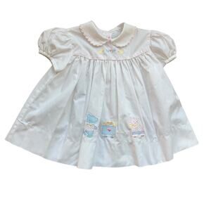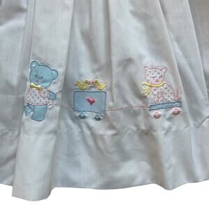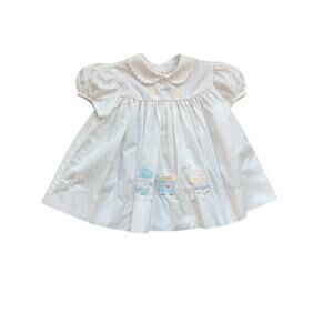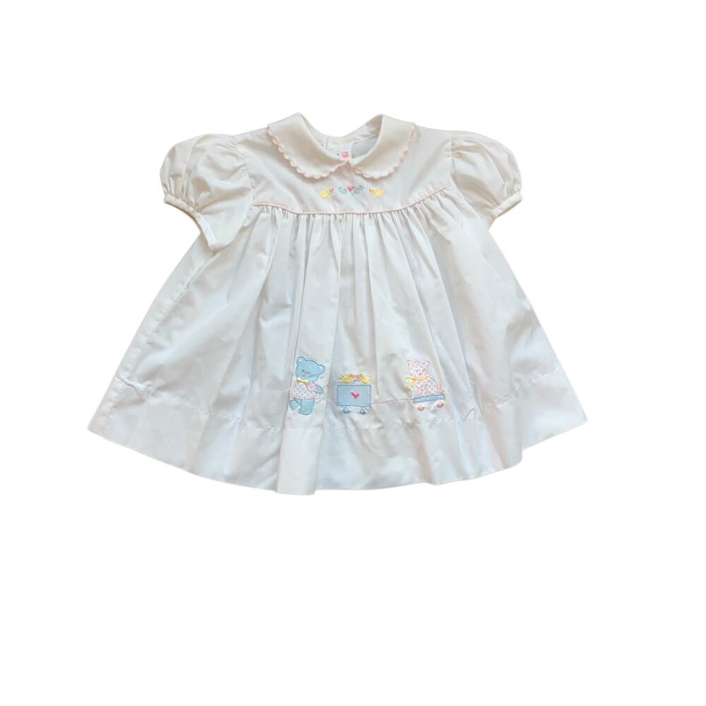 White shirt sleeve collared dress with embroidered teddy bear pulling vintage toys in pastel colors