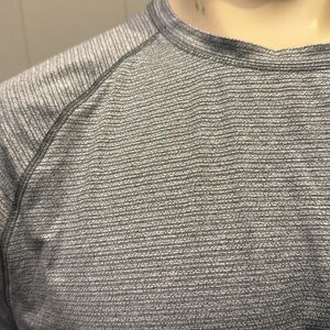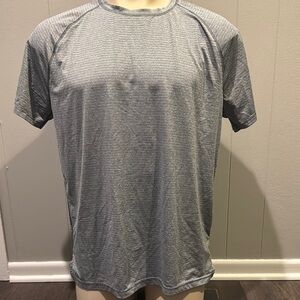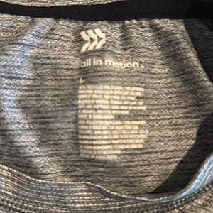 E. All In Motion gray technical fabric short sleeve workout tee. Subtle broken stitch pattern. Large. Armpit to armpit approximately 23 inches. Shoulder to hem approximately 28 inches in front; 29 1/2 inches in back. Nonsmoking home.