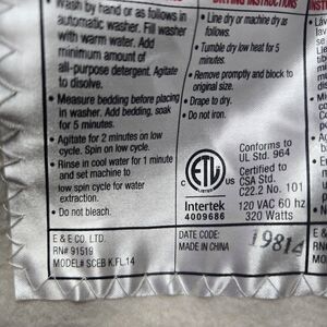 E & E Co. King Size Electric Warming Blanket Model SCEB K.FL.14 Tested Works