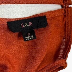 This women's top is from the E "Hanger" M brand, item has a rust like color with black designs. This top has shoulder straps with a neck securement at the back. When lying flat this top measures approximately 16 inches across from pit to pit, measures approximately 19 inches across along the bottom hem and measures approximately 19 inches from collar to bottom hem. Tag listed top as size small. Please note attached images for color and style.