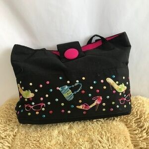 E Holland festive shoe, glasses & bag tote. It has a large pink button for closure and two solid black straps. The lining inside is pink and black Perfect for the beach and summer use, Very clean inside...See photos for details.