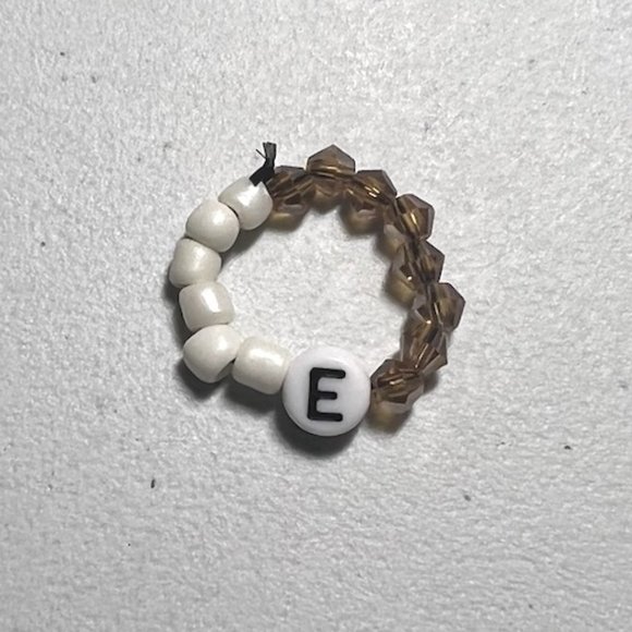 "E" LETTER CRYSTAL BEADED RING, ONE SIZE, WHITE/BROWN
