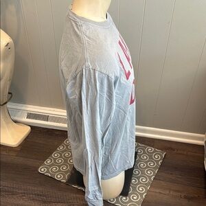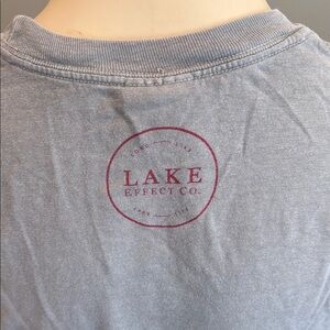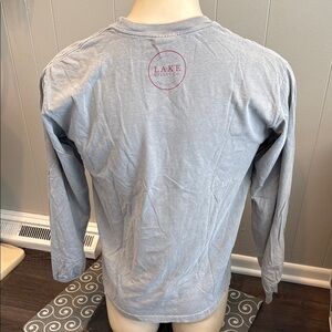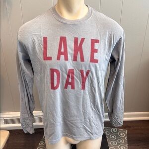 Gray long sleeve tee with bold red 'Lake Day' text. Ideal for relaxed wear.