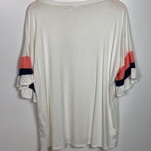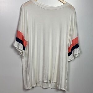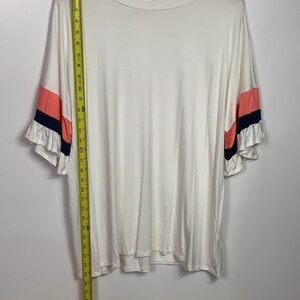 Soft off white top with salmon and navy stripes on ruffled sleeve