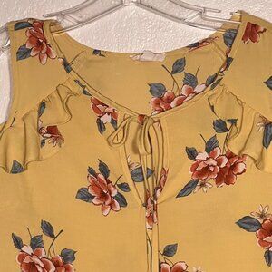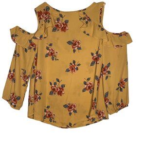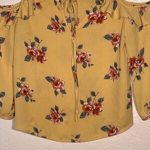 E M Medium vibrant yellow floral blouse. Designed with cold shoulders and ruffled detailing, it blends style and comfort effortlessly.