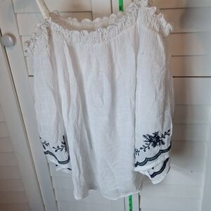 Chic white off-shoulder top featuring elegant blue embroidery. Perfect for casual outings.