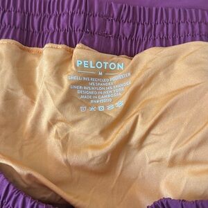 E. Peloton burgundy/orange elastic drawstring waist technical fabric workout shorts. Lined. Medium. Rise approximately 10 3/4 inches. Inseam approximately 7 inches. Nonsmoking home.