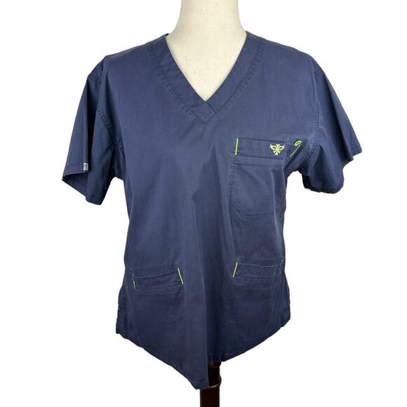 Dark blue scrub top with pockets on both sides at the hemline, left chest pocket. There is lime stitching at the ends of the pocket openings and additional design detail in lime on the upper pocket. There is lime green cloth at the back of the neckline. Smoke free home.