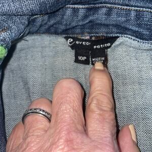 This E by ECI denim jacket features beautiful multicolor floral embroidery on a tailored silhouette. Though the tag says 10P, it fits significantly smaller — closer to a 6P or snug 8P. Please check the actual measurements before purchasing.