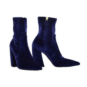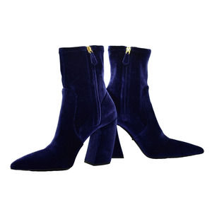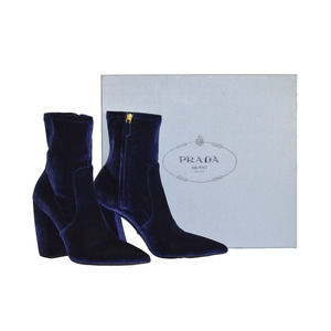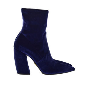 AUTHENTIC PRADA Blue "Velluto Stretch" Velvet Side Zip Curved Heel Pointed Toe Boots