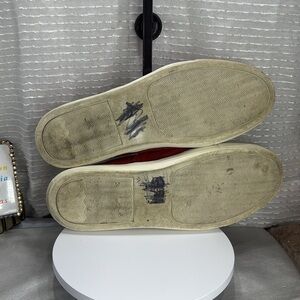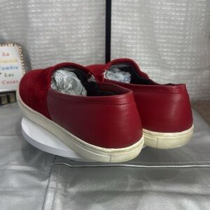 worn with some wear on the heel and some scuffing on the leather; see photo for details. Stylish and comfortable men's slip-on shoes in vibrant red. Perfect for casual outings.