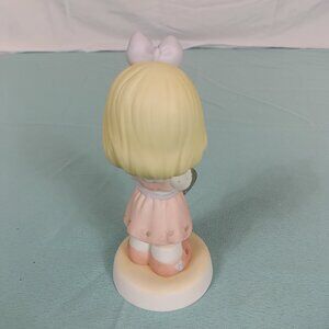 Appearance: The hand-painted figurine depicts an adorable girl with blonde, bob-cut hair and the signature teardrop-shaped eyes of the Precious Moments collection. She is wearing a white top with pink accents and a pink skirt.