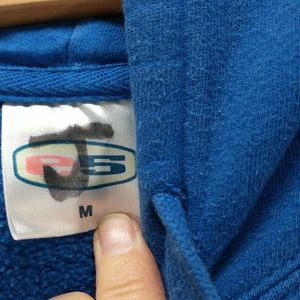 Condition: Nice Pullover Drawstring Hoodie with Logo Embroidered. 1 end drawstring frayed. Left elbow small hole as pictured.