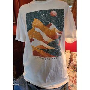 E54 Bae Vely Distressed T-Shirt Mountain Scene "Adventure Awaits"