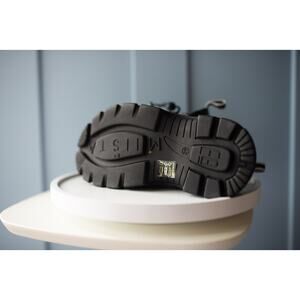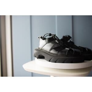 Slip on style, strappy leather uppers, round closed toe, cutout details, elastic bungee vamp strap. Slingback strap with pull tab.
