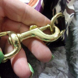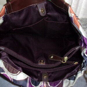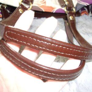 THIS IS A COACH CARRYALL BAG WITH A CROSSBODY STRAP. HAS THE SIGNATURE C'S ALL OVER IN WONDERFUL FALL COLORS. INSIDE HAS 3 SEPERATE COMPARTMENTS. THE TOP CLOSURE IS SNAP TOGETHER. THERE IS AN INSIDE ZIPPER POCKET IN ONE COMPARTMENT, ANOTHER COMPARTMENT HAS THE TWO SLIT POCKETS, AND THE THIRD COMPARTMENT IS A TOP ZIPPER CLOSURE. THE LEATHER IS BROWN PATENT LEATHER. THERE ARE SOME MARKS AND WEAR ESPECIALLY AT THE BOTTOM CORNERS FROM USE. IT IS PRELOVED AND IN GOOD CONDITION. COMES FROM A SMOKE FREE HOME AND REASONABLE OFFERS ARE ALWAYS WELCOME AND CONSIDERED.