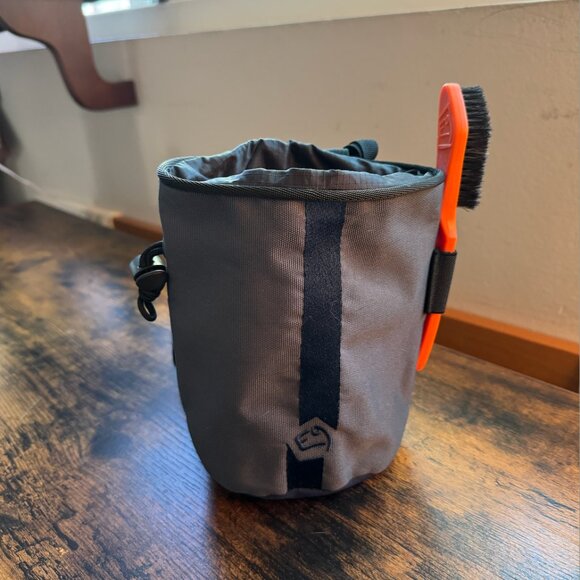 Outfitted with a lightweight canvas-like material made from polyester. The chalk bag includes a cinch-top closure to secure your chalk when not in use, zippered pocket for storage, and an adjustable waist belt. Comes with an E9 orange chalk brush.