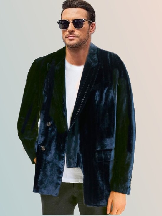 EACH OTHER soft velvet blazer in a rich deep navy blue with subtle vertical shimmer stripes adding depth and a refined, elongated silhouette. Two-button front closure, two-flap pockets, classic notch lapel and soft shoulder pads for a relaxed yet tailored body. Inner lining features a geometric diamond pattern in contrasting dark tones. Very good/excellent condition Chest 36 Inch Length 25 Inch Size S