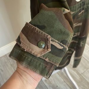 “We Are All One” camouflage trench coat by EACH X OTHER. Made in Paris. Limited Edition by Ruiz Stephinson. Zipper and snap closure down middle front. Hooded - drawstring tie. Long sleeves - with snap cuff embellishment. Super oversized fit. Pockets on frontside with snap closure. 100% cotton. Pit to pit measures 21 inches laying flat across. Size XS.