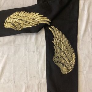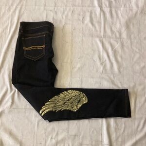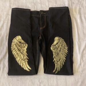 Refresh your wardrobe by upgrading with this Unique pair of Imported Skinny Jeans with Gold Wings on Back of Pants Leg. Single button/ Zip Closure, Wide Waist band, back seaming Detail . ~ Measurements: