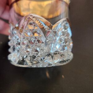 Pretty antique EAPG (Early American Pressed Glass) tumbler glass in the Button & Arches pattern. This features a gold band with hand painted roses. These were etched to order and sold as souvenirs at various locations & events in the late 1800s/early 1900s. This one is monogramed and dated 1914.