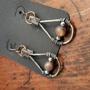 Handmade two toned earrings with beads. Wire wrapped, oxidized, tear drop shaped