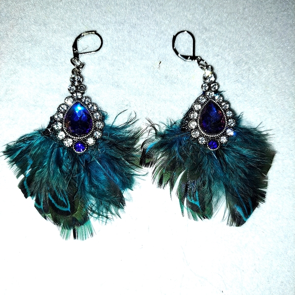 These are just awesome! Royal Blue stones embellished with various shades of blue feathers on silver hooks.