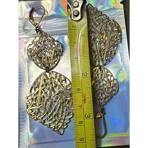 Add a touch of vintage glamour to your outfit with these beautiful goldtone chandelier earrings. Crafted in the 1980s, these earrings feature a stunning butterfly shape with a hinged closure for easy wear. The earrings are 3.5 inches in length and are designed to fit comfortably on your lobe. These earrings are perfect for any occasion and will complement any outfit. The vintage feel make them a unique addition to your jewelry collection. These earrings are a must-have for anyone who loves vintage jewelry.