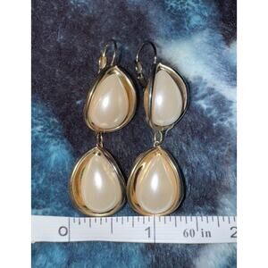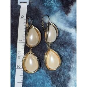 -EARRINGS VTG Wedding Drop Dbl Faux Pearl Craddled On Gold Tone