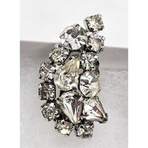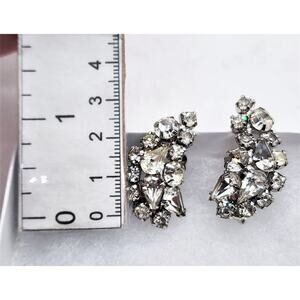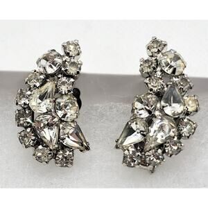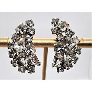 Vintage rhinestone clip on earrings by Juliana D&E. Multi faceted clear rhinestones in different sizes and shapes. The overall shape is like a leaf. The back is a classic Juliana solid setting. The metal is a silver tone. They have a really nice sparkle to them that is hard to capture in photos.