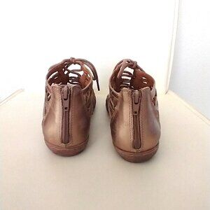 Very comfortable. Zip closure with tie front for custom fit. Pre-loved, but Lots of wear left in these!