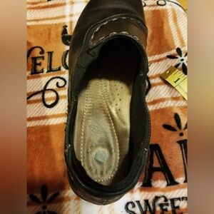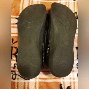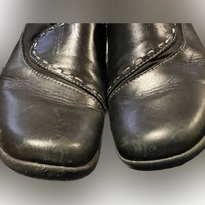 The inside of the shoe has discoloration from wear. The elastic on the top of the shoe also has wear.