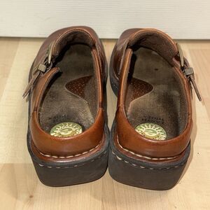 The EARTH SHOES Women's Size 8.5 Brown Leather Shoes are a stylish and comfortable option for casual wear. These slip-on clogs feature a round toe, low heel height, and a buckle detail for added flair. Made of high-quality leather, these clogs offer a medium shoe width for a comfortable fit. The solid brown color and classic clogs style make these shoes versatile for everyday wear. Perfect for the woman looking for a blend of fashion and functionality in her footwear collection.