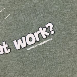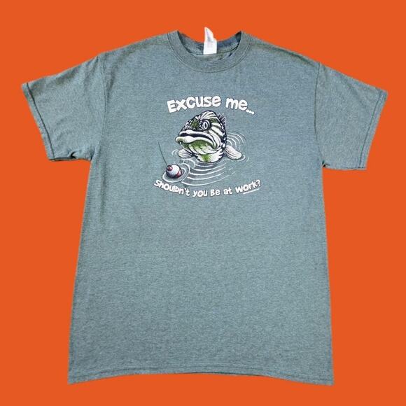 THE GRAPHIC HAS A VERY JUDGY BASS FISH. IT SAYS “Excuse me… Shouldn’t you be at work?” THE COPYRIGHT SAYS 2015 EARTH SUN MOON. IT IS IN AMAZING CONDITION AND DOESN’T LOOK LIKE IT HAS EVER BEEN WORN. IT IS A SIZE MEDIUM.