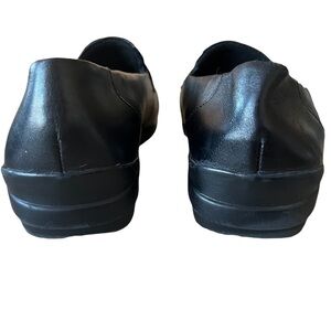 Earth Shoe Appleton Black Leather Loafer. Square toe, top faux buckle, slip on style.