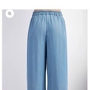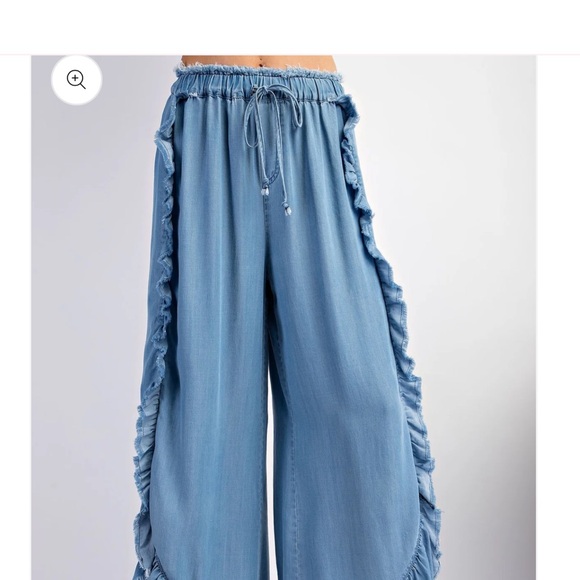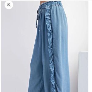 Easel Tencel blue wide leg pants featuring elegant ruffle details. Perfect for any occasion, these pants offer both comfort and fashion.