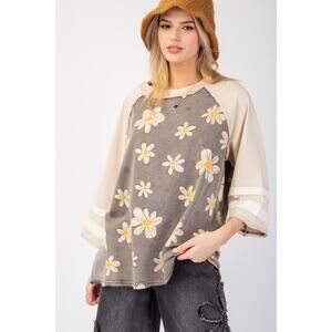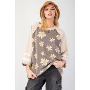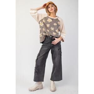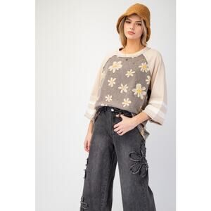 This top by Easel Clothing of Los Angeles brings playful charm to your wardrobe. The top features a mineral-washed daisy flower print on both the front and back. The ΒΎ length raglan sleeves are accented with contrasting stripes. The official color name for this comfortable and stylish piece is Ash, making it a versatile addition to your casual collection.