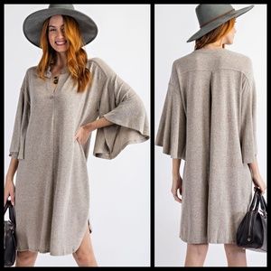 EASEL Hacci Knit Sweater Dress Mandarin Collar V-Neck & Statement Bell Sleeves