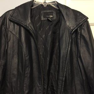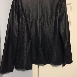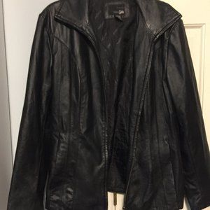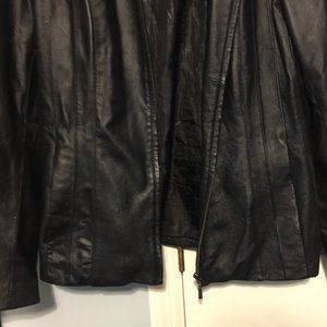 EAST 5TH LADIES SIZE M BLACK GENUINE LEATHER JACKET. POCKETS ON SIDE. ZIPS FOR CLOSURE. POLYESTER LINING.