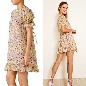 A conservative crewneck, playful short sleeves, and a ruffled hem add a bit of whimsy to this cheeky floral mini dress by The East Order from Australia’s famous Byron Bay. Throw in a belt to accentuate your waist, or keep it light and breezy without.