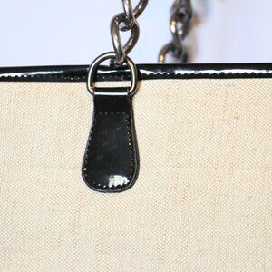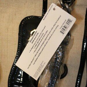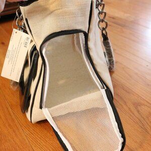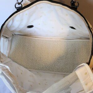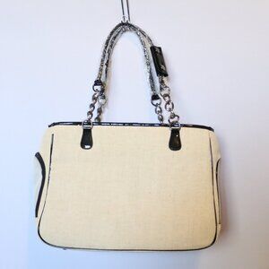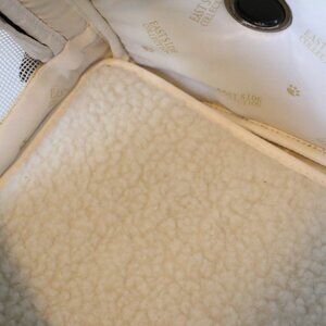 Rare find! This pet carrier is a tote-style carrier with a natural-colored canvas and patent leather-like trim. Design looks similar to a Fendi B bag. East Side Collection tag states "Firenze Carrier" and holds up to 22 pounds. Includes a collar clip inside. Mesh on three sides. 16" across x 12" tall x 7" deep. Never been used and still has the tag and plastic on the handles. There is a black mark on the mesh on one end and a small red mark on the bottom.