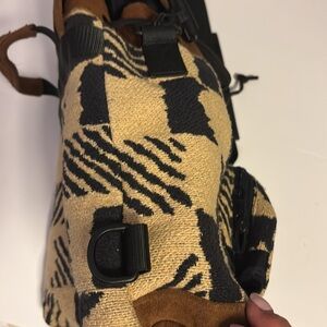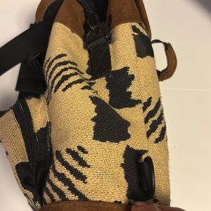 Stylish backpack with a unique black and brown pattern. Features a secure buckle closure and adjustable straps. Suede accents. Draw String closure. Adjustable crossbody straps. Small suede handle as well. 2 zipper pockets outside bag.Preloved lots of life left❤️