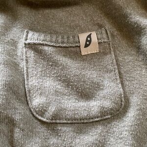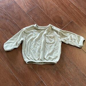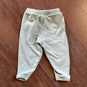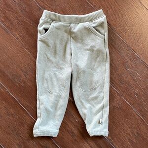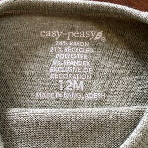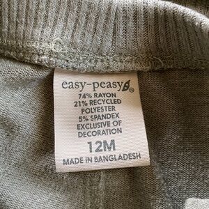 This comfortable kids' set by EASY PEASY features a soft olive top and matching bottoms in size 12 months. Top has a cute mini pocket at front; cuffed bottom and sleeves. Bottoms have pockets and cuffs at bottom; they sport a cute patch at knee area. Mix of rayon/recycled polyester and spandex makes this a comfy lounging and base layer set. Cleaned and comes from a pet and smoke-free home.