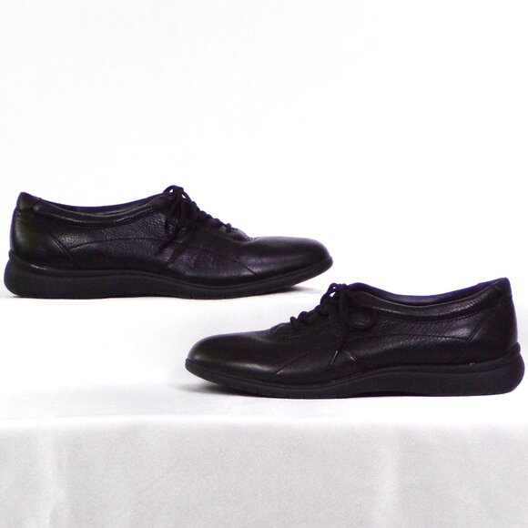 IF YOUR JOB REQUIRES LONG PERIODS ON YOUR FEET, YOU’LL APPRECIATE THE COMFORT AS WELL AS THE CLASSIC ELEGANCE OF THESE BLACK FLAT-HEEL OXFORDS BY EASY SPIRIT, SIZE 7.5M, MODEL NAME ESMOVEON. They’re gently pre-owned, in excellent or better condition, with faint traces of wear on the soles (picture #14) and light creasing of the uppers where they bend when walking, but otherwise free of defects, damage, or signs of wear. They have soft, cushioned insoles and arch supports to help keep your mind focused on your work, not on your aching feet. The uppers are leather with a crinkled finish, other materials synthetic. The stated size is 7.5M, but prospective buyers are encouraged to compare the measurements with those of shoes that they know fit well prior to purchase. Inside measurements are: length, heel to toe 9.75”; widest point 3”; narrowest point 2”. Heel height is 1”.