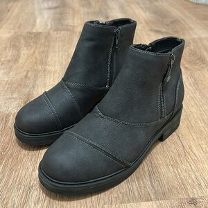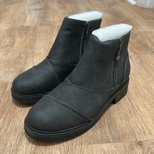 - features a stylish zipper, contemporary block heel, and an on-trend mini lug non-marking slip-resistant outsole