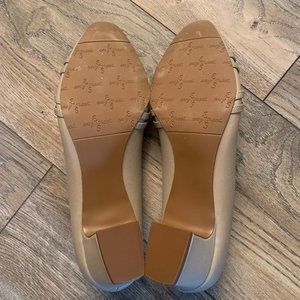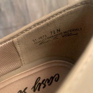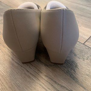 EASY STREET WALLIS WOMEN'S BLOCK HEEL PUMPS/HEELS COLOR OATMEAL LINEN SIZE 7.5 IN GREAT CONDITION OTHER THAN THE LEFT PUMP HAS A SCUFF ON THE TOE.