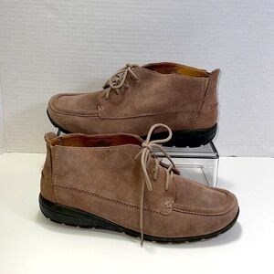 Easy spirit adagio suede/leather booties in moccasin style, lace up. Has an elastic gussets on each side of the back heel for added comfort. Size 7 1/2. Shaft is about 3 “ tall. Good used condition. Suede does show some wear in the texture (not like “fluffy” new suede) as expected. Lots of tread still left. Some minor discoloration on side wall and side, Please see pictures for condition.
