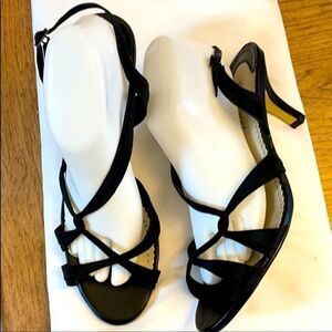 EASY STREET STRAPPY LEATHER/FABRIC SANDALS. INSOLE IS VERY NICELY PADDED FOR COMFORT. 3.25 INCH HEEL. SIZE IS 9.5WW. NEW