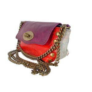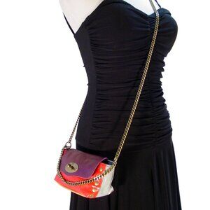 Stunning leather cross body mini-bag by Ebarrito, this design combines bold colors and textures for plenty of visual interest. Two attached brass chains, one to wear across the body, the other is the perfect wrist strap length. Turn lock closure. Canvas lining. Great for lipstick, credit cards, sunglasses. Can hold a smaller cell phone. Made in Italy.