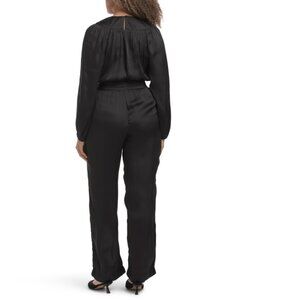 keyhole back with button closure, snap button neck detail, pleated details, satin finish, 2 front pockets, smocked waistband